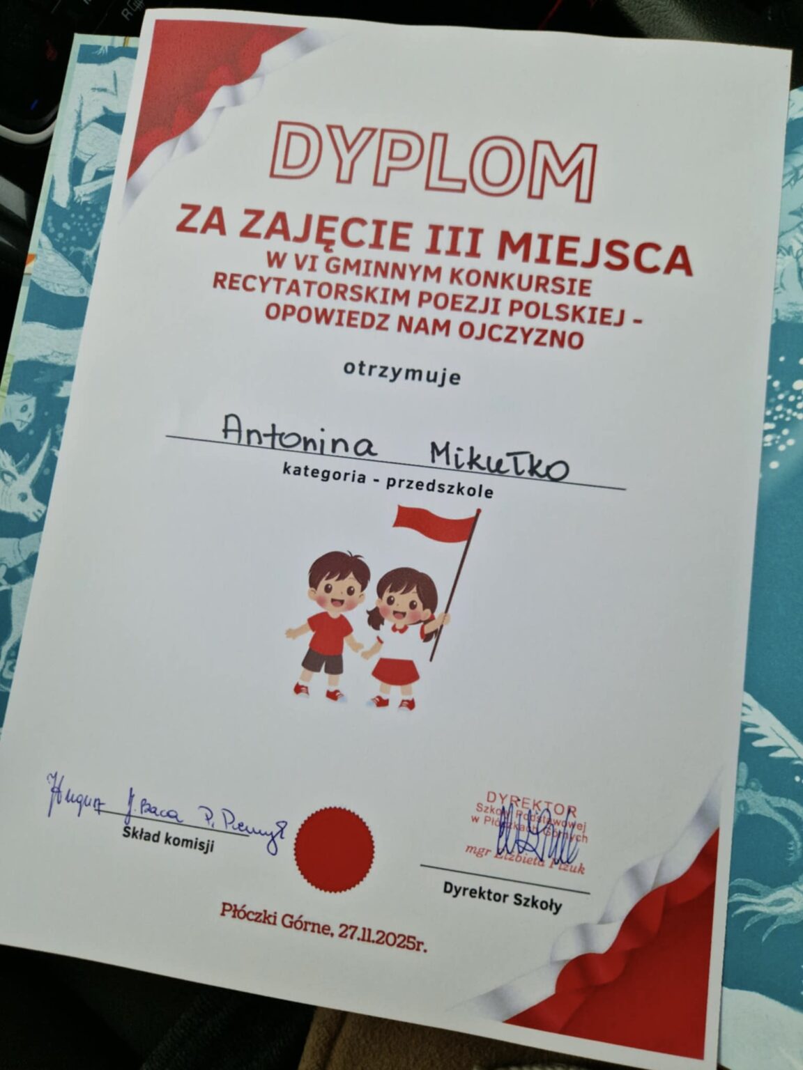 W czwartek Antonina M. i Cezary Sz. brali udział w VI Gminnym Konkursie Recytatorskim Poezji Patriotycznej „Opowiedz nam Ojczyzno” organizowanym przez Szkołę Podstawową w Płóczkach Górnych.